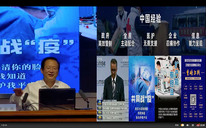 罗公利以“在战‘疫’中我们一起成长”为题,带领全体同学共同思考“在战‘疫’中我们听到看到了什么?”“在战‘疫’中我们想到悟到了什么?”“在战‘疫’中我们能做该做什么?”三个问题。罗公利从守望相助、英雄凯旋、中国担当等七个关键词中总结了“战疫”中我们的所见所闻,带领同学们回望战“疫”的过程,结合战“疫”中典型的人和事阐述“中国力量”与“中国精神”已成为“战疫”的重要推动力。他积极赞扬青年一代在疫情中表现出的逆流而上、敢于冲锋的担当,同时对于青年学生在培育家国情怀、增强报国本领、强化责任担当、学会理性思考四个方面提出了新的期望。
