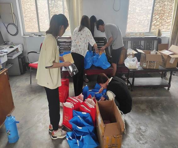 图为志愿者们正在为孩子们准备六一儿童节礼物